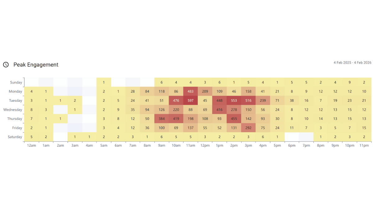 Identify when your audiences are most likely to engage, based on real behaviour. Peak engagement insights help messages land at the right time without increasing email volume.
